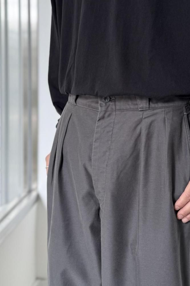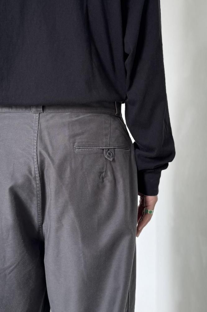 仏軍初期型ミリタリートラウザーズに着想した、太めのベルトループやヒップポケット上のダーツ、両玉縁ポケットが特徴のデザイン。